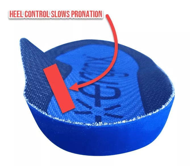 By controlling the heel at heel strike through maintaining the calcaneal inclination angle (marked below) we can help to correct and slow the rate of pronation. This reduces the forces that area applied to the feet during walking.