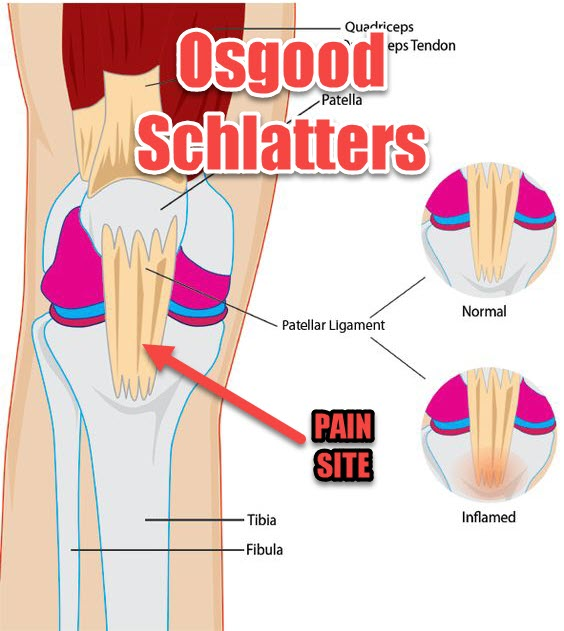This type of growth pain occurs under the knee cap where the patella tendon inderts into the Tibia. When we overwork our quadriceps muscle or our leg internally rotates too much there is excessive strain placed on the patella ligament.